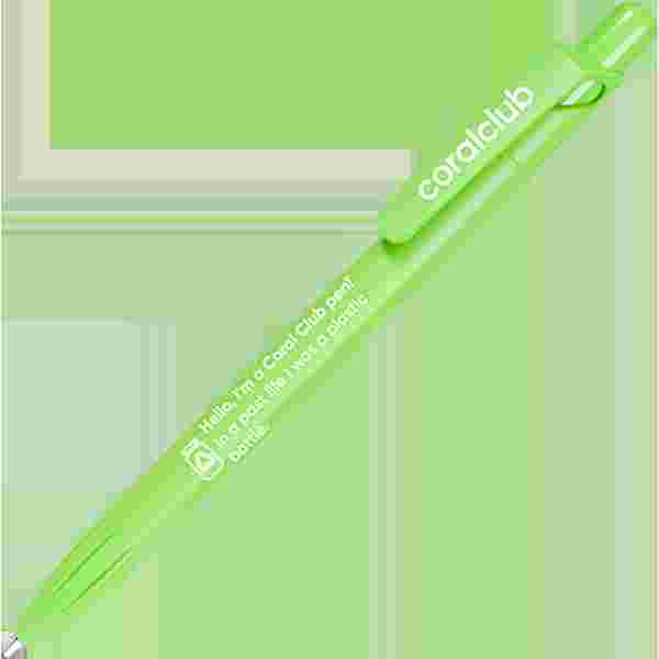 Kuličkové pero s tlačítkovým mechanismem vyrobené z PET RECYKLOVANÉHO materiálu s nápisem "Ahoj, jsem pero Coral Club! V minulém životě jsem byl plastový kelímek".